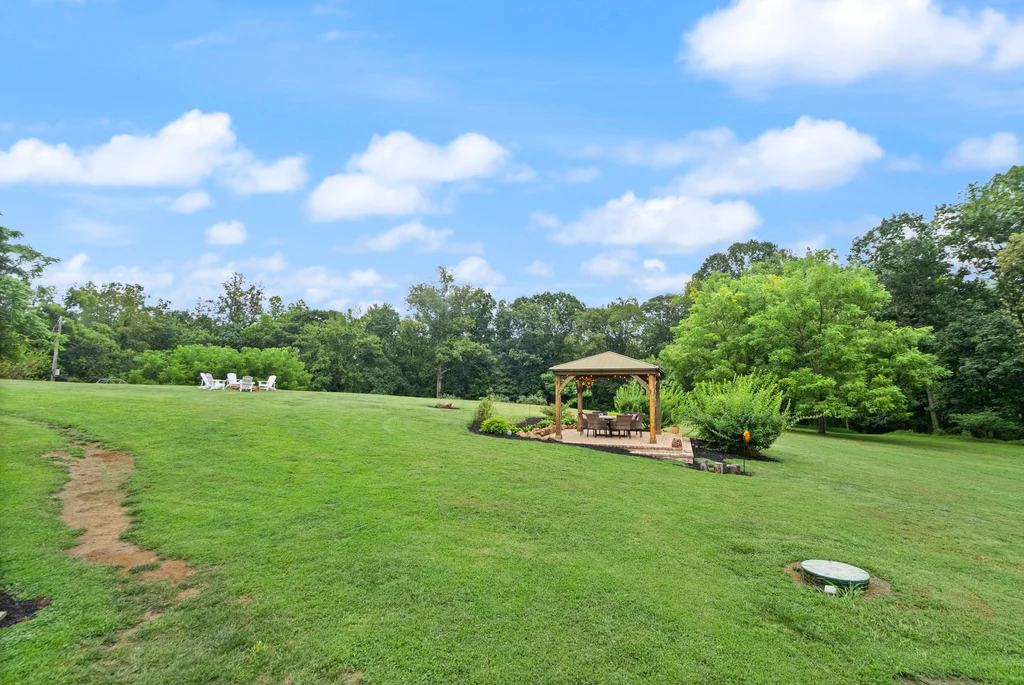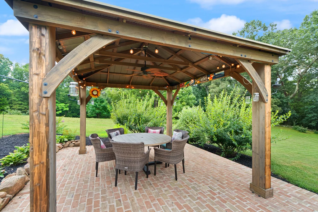 Step outside to a brick patio with gazebo, surrounded by mature landscaping that creates a peaceful, private backdrop for gatherings or quiet mornings with coffee.